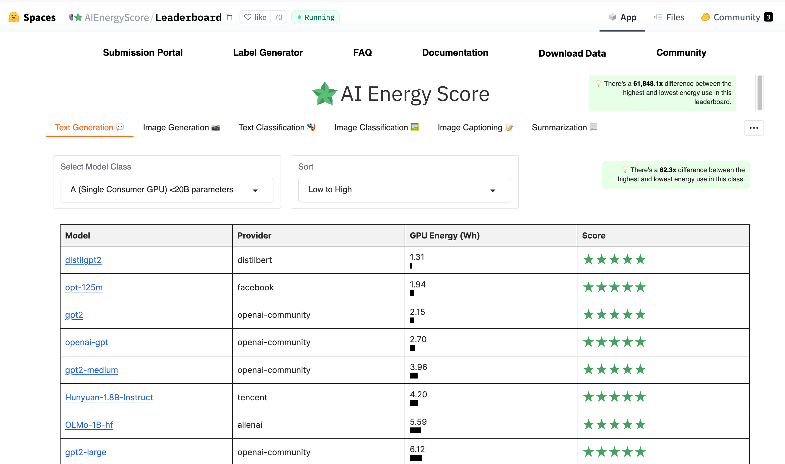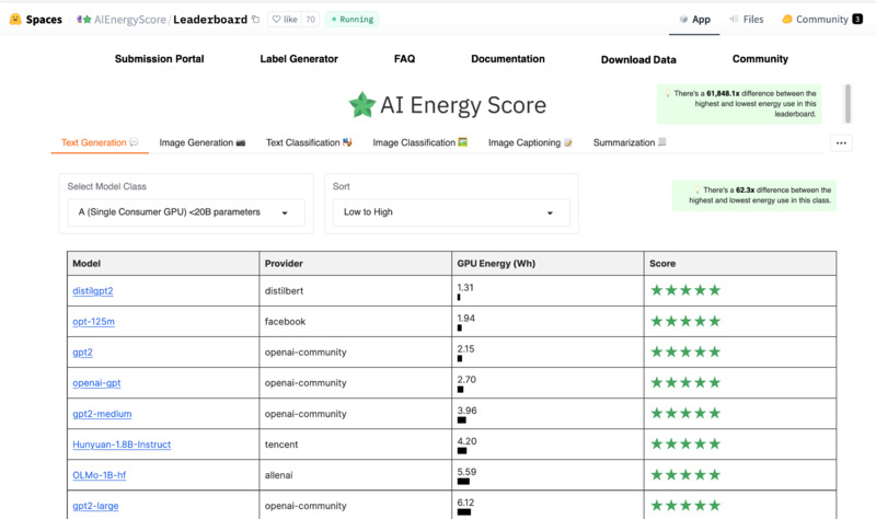 L’AI Energy Score est un système qui classe les modèles d’IA selon leur consommation énergétique GPU pour une tâche donnée, sur 1 000 requêtes, répété 10 fois, puis converti en note relative de 1 à 5 étoiles.