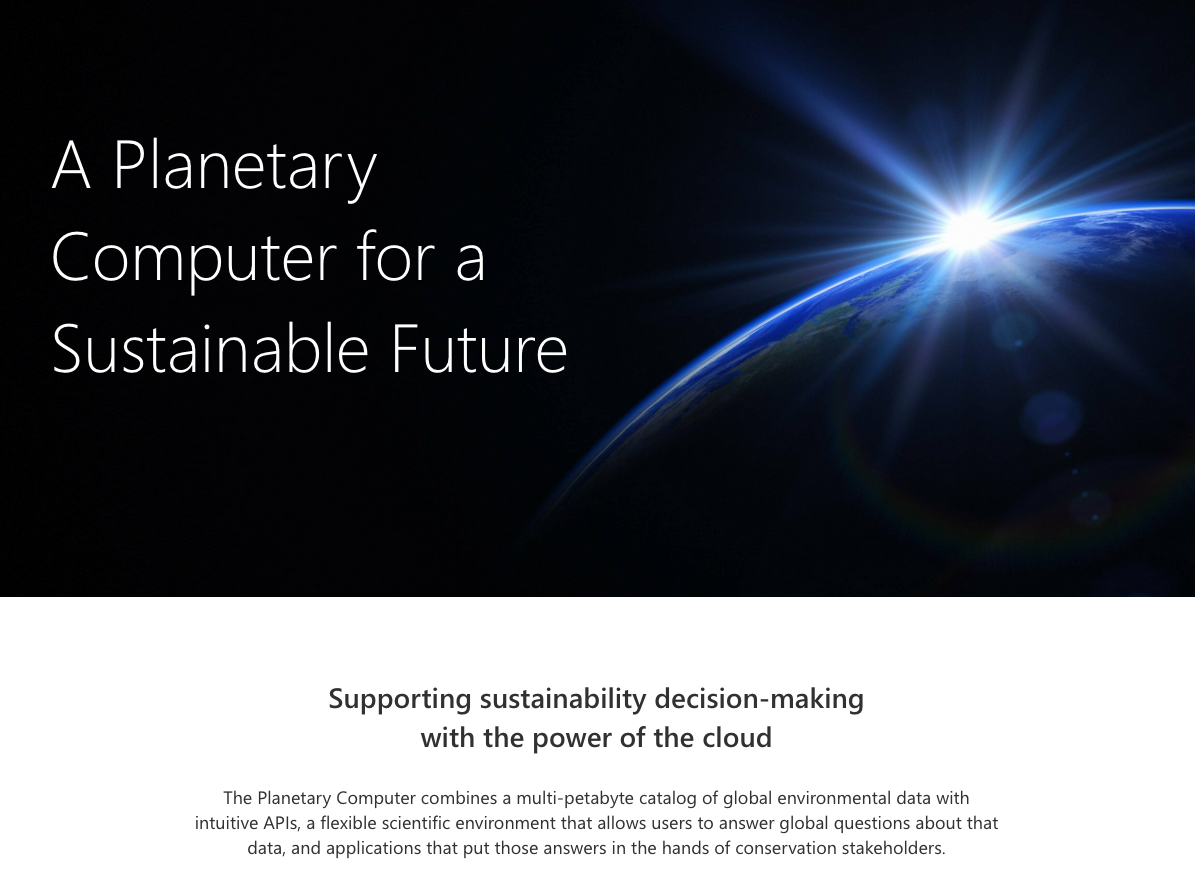 - The Planetary Computer est une plateforme ouverte d’analyse environnementale conçue par Microsoft. Elle repose sur trois initiatives : un catalogue de données publiques rassemblant plusieurs pétaoctets d’informations sur les systèmes terrestres (climat, sols, eau, biodiversité, imagerie satellitaire), hébergées sur Azure et accessibles gratuitement; des APIs permettant de rechercher et d’interroger les données selon les dimensions spatiales et temporelles (espace, temps, variations géographiques et séries historiques) et un écosystème d’applications axé sur la durabilité environnementale développées par un réseau de partenaires.