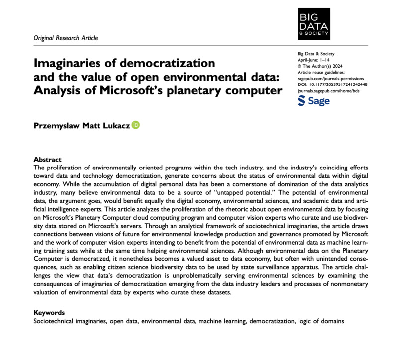 - Imaginaries of democratization and the value of open environmental data: Analysis of Microsoft’s planetary computer
