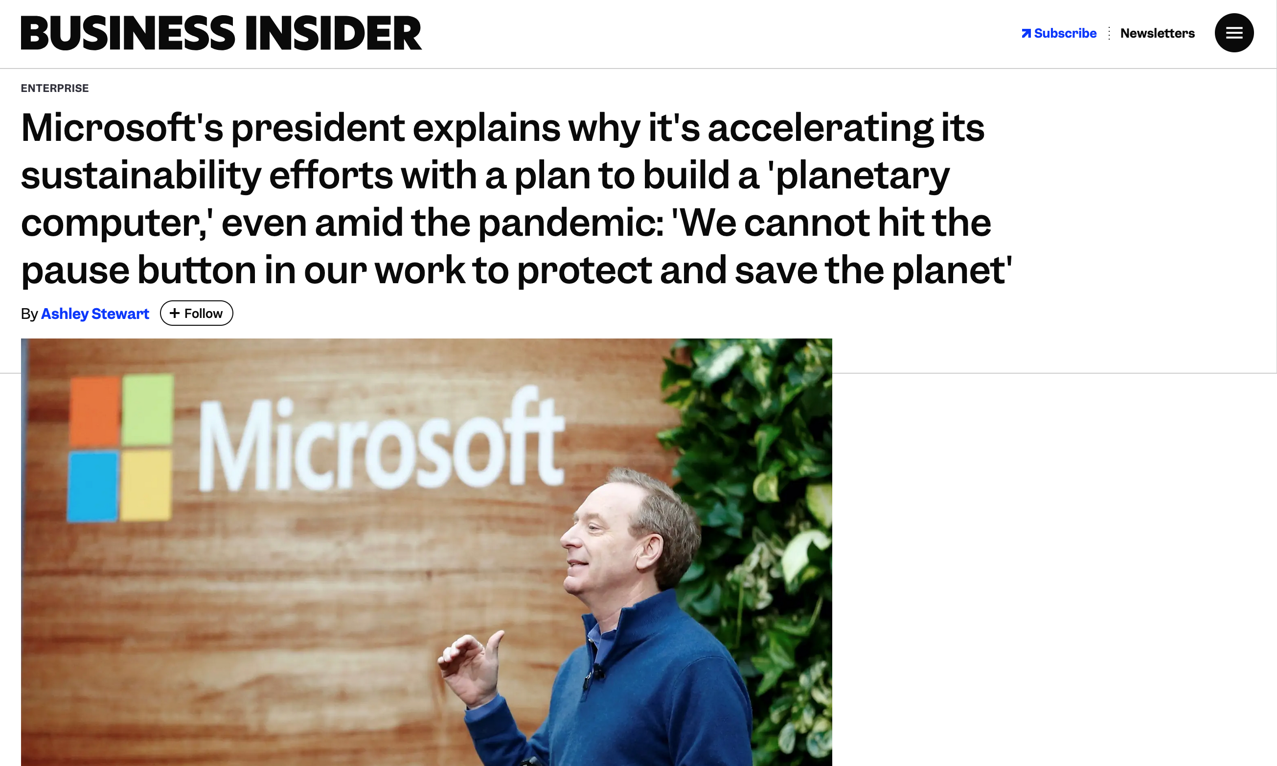 - Microsoft's president explains why it's accelerating its sustainability efforts with a plan to build a 'planetary computer,' even amid the pandemic: 'We cannot hit the pause button in our work to protect and save the planet'