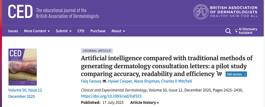 - Artificial intelligence compared with traditional methods of generating dermatology consultation letters: a pilot study comparing accuracy, readability and efficiency