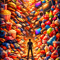 Cette expérimentation vise à explorer l’hyperbole visuelle comme figure de style appliquée à la représentation de la surconsommation. L’image produite ne cherche pas à documenter une situation réaliste, mais à exagérer volontairement les proportions, l’échelle et l’organisation des objets afin de rendre perceptible un phénomène social abstrait. L’intention est de provoquer une lecture symbolique et critique chez le regardeur, en assumant une représentation volontairement non réaliste.