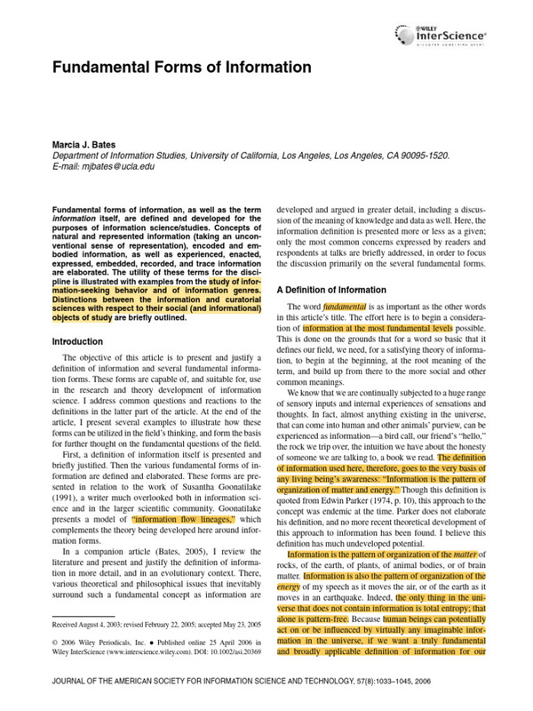- L'article propose une définition fondamentale de l'information, « un schéma d'organisation de la matière et de l'énergie », et identifie plusieurs formes fondamentales d'information (naturelle, représentée, encodée, incarnée) pour les besoins de la science de l'information. Ces formes sont reliées au modèle des « lignées de flux d'information » de Susantha Goonatilake (1991), distinguant trois voies de transmission : la matière, l'énergie et les informations représentées. Bates répond aux objections courantes et illustre l'utilité de ces concepts pour l'analyse des pratiques informationnelles (bibliothèques, recherche documentaire, etc.). L'article vise à fournir un cadre conceptuel commun à la discipline, permettant de distinguer les phénomènes informationnels des phénomènes physiques ou énergétiques.