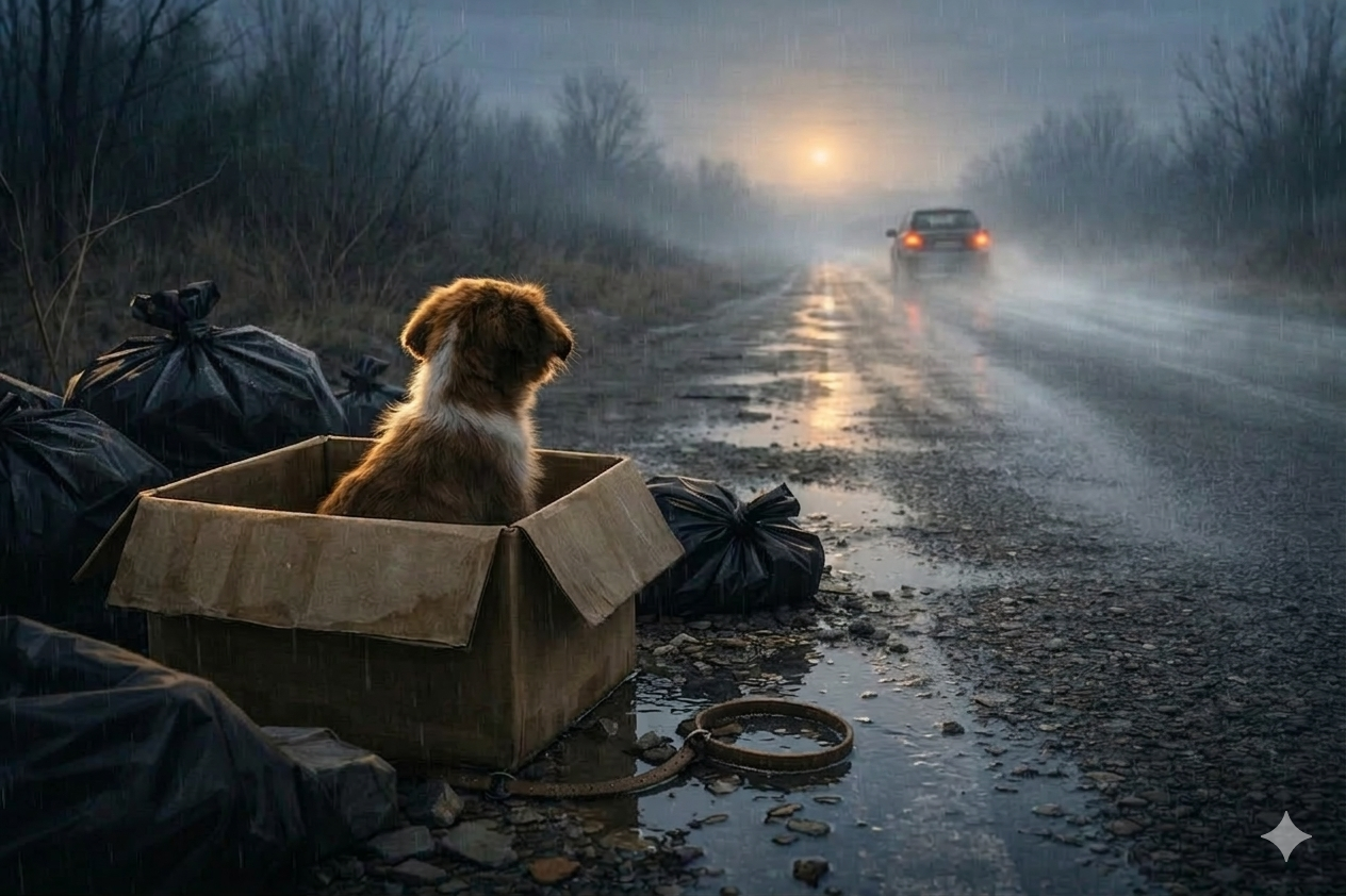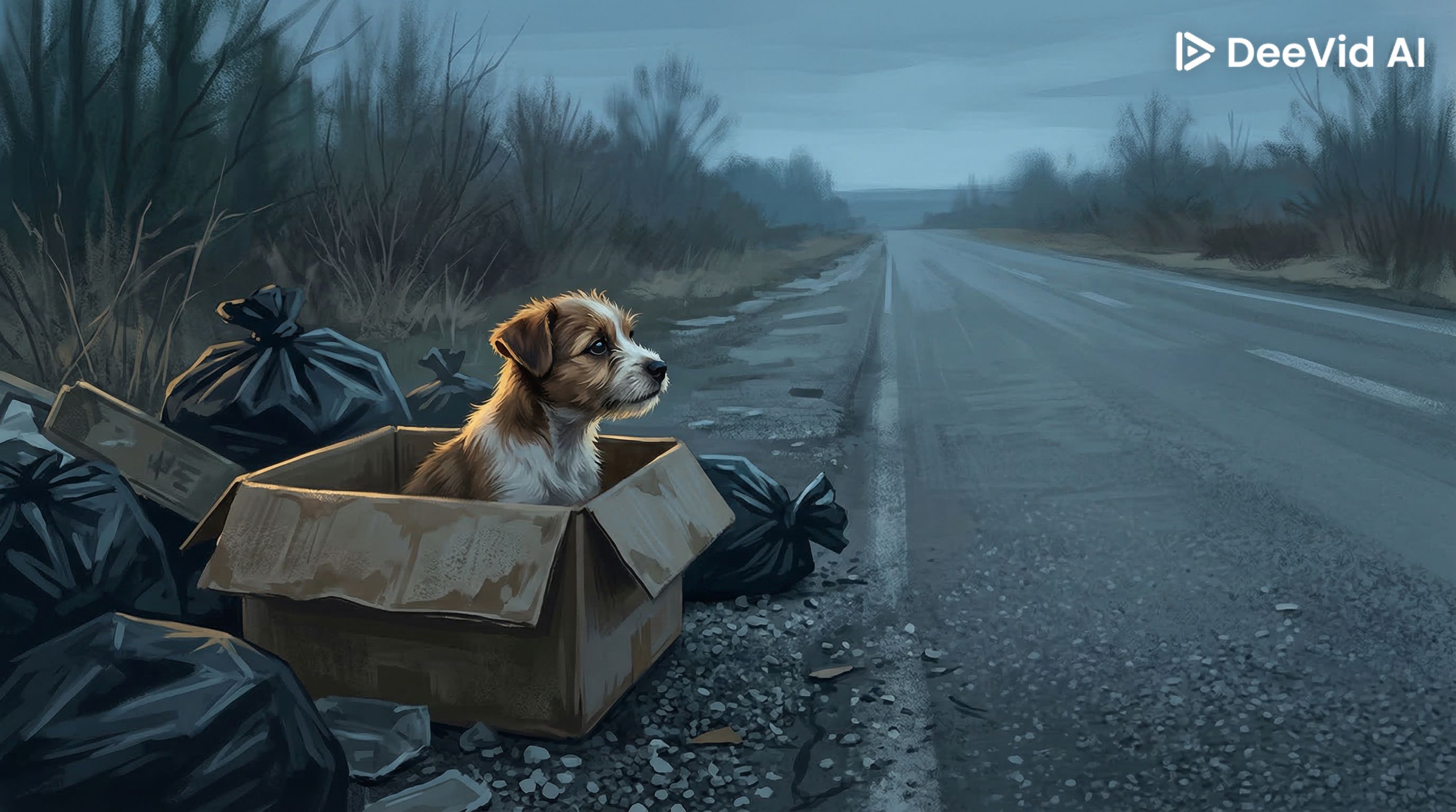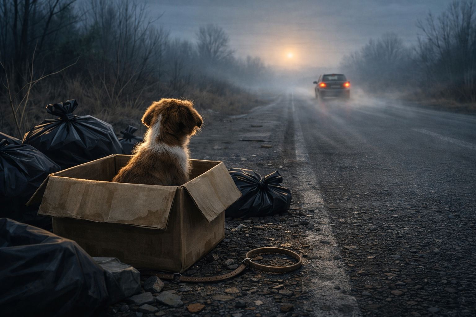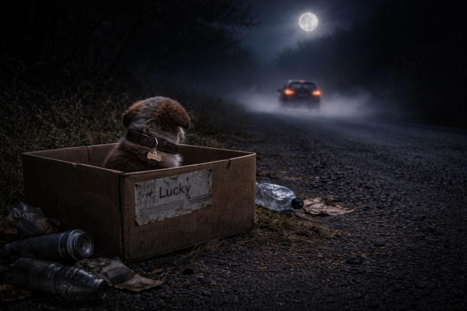 L’image a été conçue pour raconter une histoire visuelle et susciter l’émotion par le choix des signes : chiot seul (symbole de vulnérabilité), boîte abîmée (abandonnée), déchets (négligence sociale), route sombre (danger), fumée (mouvement du véhicule), lune (ambiance nocturne), et collier avec étiquette (dimension humaine et personnelle).