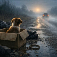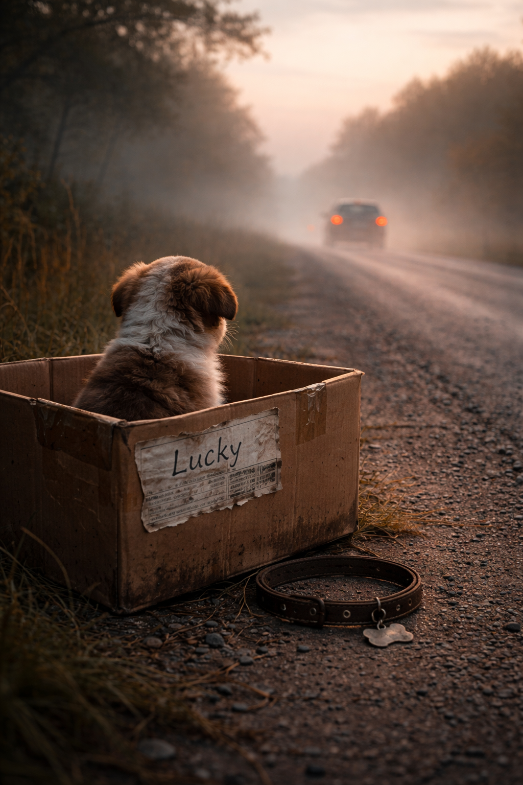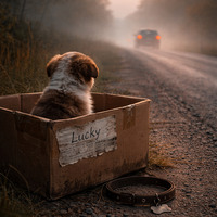 voici le premier prompt que j'ai utilisé : A small, lonely puppy sitting in a worn cardboard box at the side of a foggy, empty road at dawn. The puppy looks directly at a car driving away in the distance, its sad gaze full of longing.