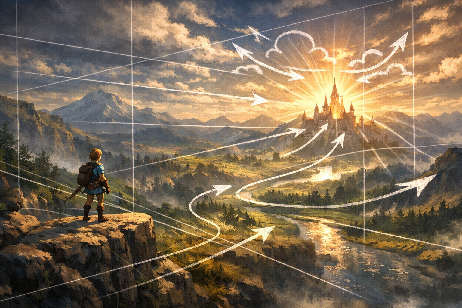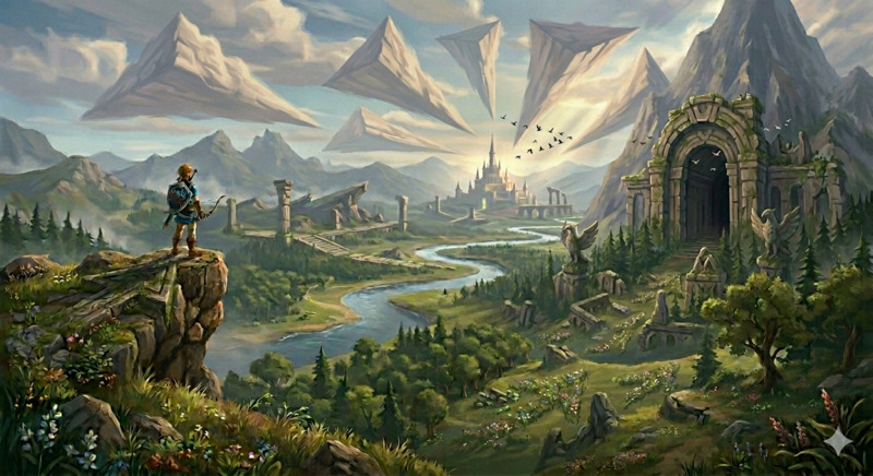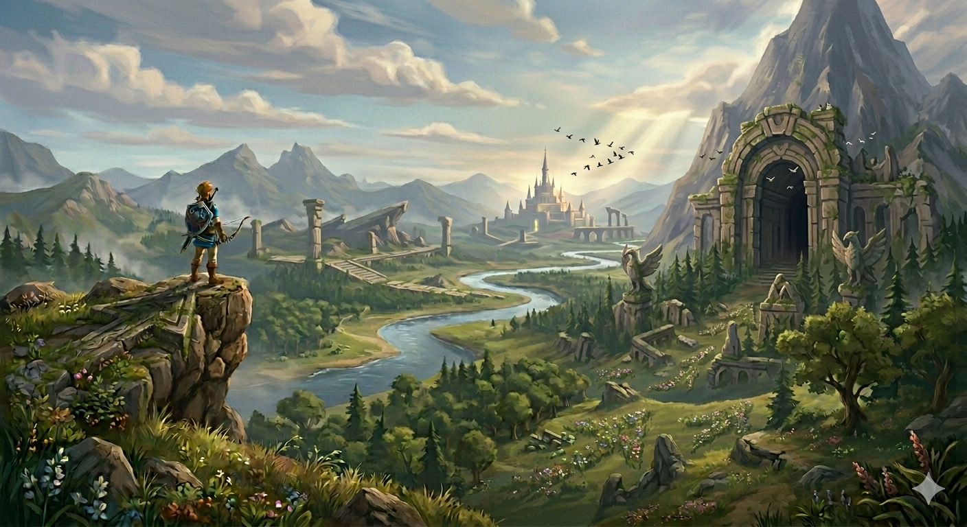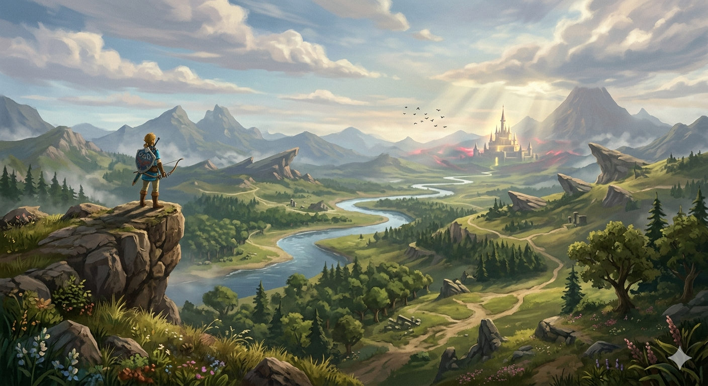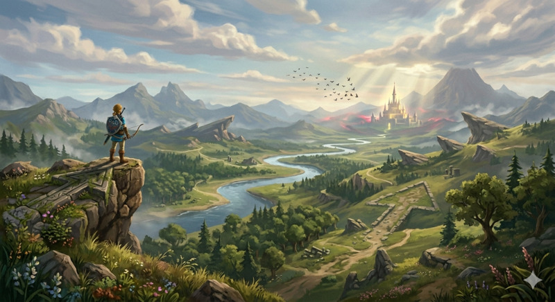 Cette image, inspirée des codes visuels de The Legend of Zelda: Breath of the Wild, met en scène un personnage placé en hauteur qui observe un vaste paysage évoquant un monde ouvert et une liberté d’exploration totale. À première vue, la scène semble naturelle, immersive et non contrainte, mais elle repose en réalité sur une construction visuelle très précise qui oriente le regard du spectateur vers un point focal unique : le château à l’horizon. Les signes iconiques, tels que le personnage, les montagnes, la rivière et les ruines, permettent une reconnaissance immédiate d’un univers vidéoludique familier, renforçant l’immersion. Toutefois, ce sont surtout les signes plastiques qui structurent le sens de l’image : la composition de gauche à droite crée un parcours visuel logique partant du personnage, traversant le paysage et menant au château; la rivière agit comme une ligne directrice sinueuse qui guide naturellement l’œil; la perspective atmosphérique accentue la profondeur et attire vers le centre; et les rayons lumineux convergent subtilement vers le point focal, renforçant son importance. À cela s’ajoutent des éléments directionnels intégrés dans la nature, comme le vol des oiseaux, l’orientation des ruines, la disposition des arbres et les répétitions de formes qui orientent inconsciemment le regard dans une même direction. Ces indices, bien qu’iconiques, fonctionnent comme des signes plastiques directionnels, créant un système de guidage invisible. L’absence de signes linguistiques renforce l’expérience immersive et oblige le spectateur à interpréter uniquement à partir des éléments visuels. L’image propose ainsi une double lecture : une première, où elle est perçue comme un paysage libre et ouvert, et une seconde, plus analytique, où l’on comprend que cette liberté est en réalité construite et contrôlée. Cette expérimentation démontre que, même dans un univers qui semble offrir une totale autonomie, le regard du spectateur est orienté de manière stratégique, révélant que l’illusion de liberté repose sur une mise en scène visuelle rigoureuse et sur l’utilisation consciente des signes. Voici mon prompt final : A wide cinematic fantasy landscape inspired by The Legend of Zelda: Breath of the Wild. A lone adventurer stands on a cliff on the left, overlooking a vast open world with a winding river, forests, ruins, mountains, and a distant glowing castle as the focal point.