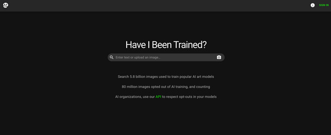Have I Been Trained? est une œuvre qui prend la forme d’un outil web interactif. Développée par le collectif Spawning (Mat Dryhurst et Holly Herndon), elle s’inscrit dans une pratique artistique qui interroge la gouvernance des données produites par les artistes à l’ère de l’IA. L’interface permet à l’utilisateur·ice de téléverser une image ou d’entrer un nom afin de vérifier si ces contenus apparaissent dans LAION-5B, une base de données massive utilisée pour entraîner des modèles d’IA générative.